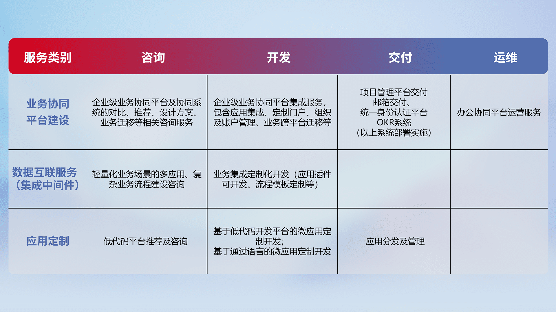 针对钉钉、、、、企微、、、、IDaas等平台级产品提供产品的规划、、、、方案、、、交付、、定制化开发等服务,,实现如统一协同办公、、智能客户服务、、、混合会议管理、、、、智能数据查询、、等业务场景,,,,实现数字化转型。。